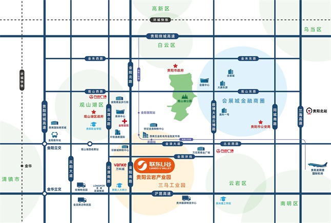 园区市政道路享受的是观山湖的配套,云潭北路南起惠源路,连接着云岩区,观山湖区和白云区;还有数博大道云博路它是除人民大道以外的第二条经济主干道。其次,地铁2号线现已经开通了,距离最近的茶园地铁站仅1.2公里。从产业配套来说,项目周边有宏腾物流园,金龙腾达物流园,西南五金机电专业批发市场。从生活配套来看,项目享受的是贵阳市的城市核心配套,世纪金源商圈距离项目仅约2公里,该处汇集了世纪金源购物中心、国贸tpmall,居然之家、印象城等大型商业综合,可满足您的购物休闲及生活所需;医疗配套方面,项目距离金阳医院(三甲医院)直线距离约4公里,距离目前人大附板块在建的云岩区人民医院(二甲医院)、妇幼保健院、疾控中心直线距离约2公里,优质医疗为您和家人的健康保驾护航。